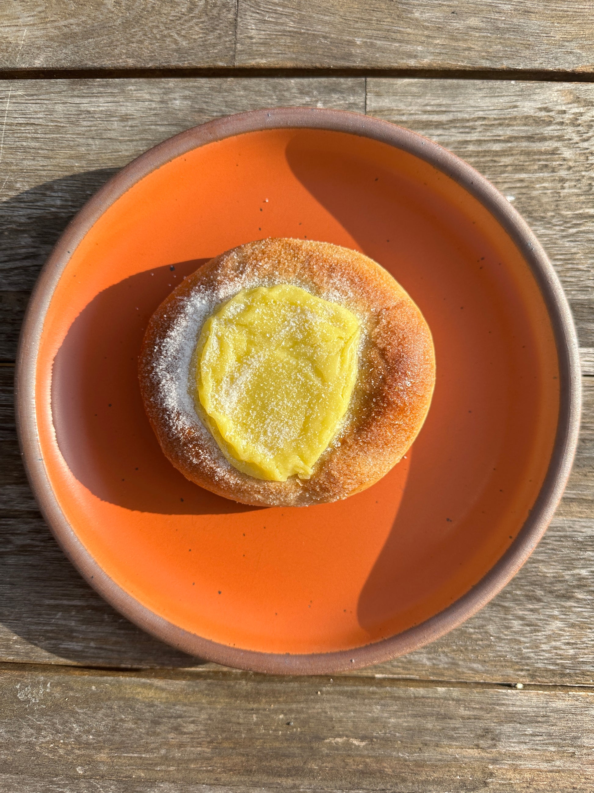This sourdough bun is filled with cardamon and topped with a vanilla pastry cream.